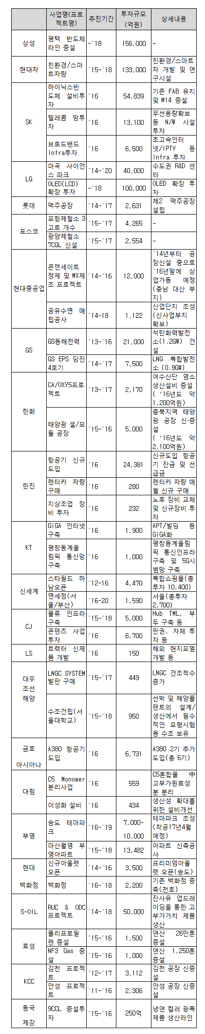 | ▲ 30대 그룹 주요 투자프로젝트 현황 |
