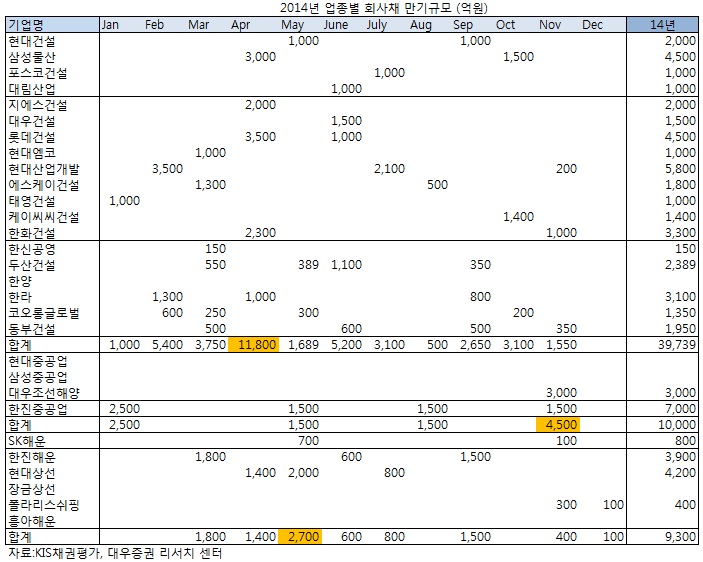 조선업종의 경우 전체 만기도래 금액이 1조원에 달하며 이 중 대우조선해양의 3000억원을 제외하면 한진중공업에 나머지 7000억원이 몰려있다. 한진중공업의 회사채 만기 도래기간은 대체로 분산돼 있지만 연말에 4500억원으로 금액이 다소 커진다.