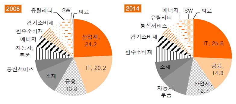 2008년 금융위기 이후 코스피 시가총액 100위 기업 중 20% 이상이 탈락하고 새로운 기업들이 자리를 채웠다. 해운업을 중심으로 산업재가 부진한 반면, 소비재 기업이 신규진입의 3분의 1 가까이를 차지하며 내수관련 산업이 약진했다.