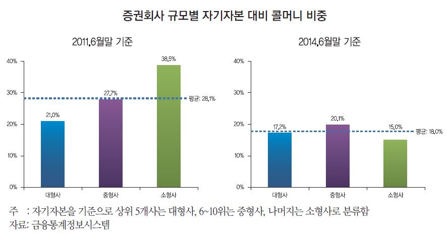 이를 염두에 둔 증권사들은 콜머니 차입 비중 축소에 나섰고 RP와 전단채를 통해 단기자금을 조달했다. 2011년 증권사의 콜머니 비중은 36.6%에서 꾸준히 감소해 지난 6월말 19.2%까지 하락했다. 증권사들의 자기자본 대비 콜머니 비중이 감소한 가운데 소형사가 38.5%로 감소세가 가장 두드러졌다. 중형사는 27.7%, 대형사는 21.1% 순이었다.