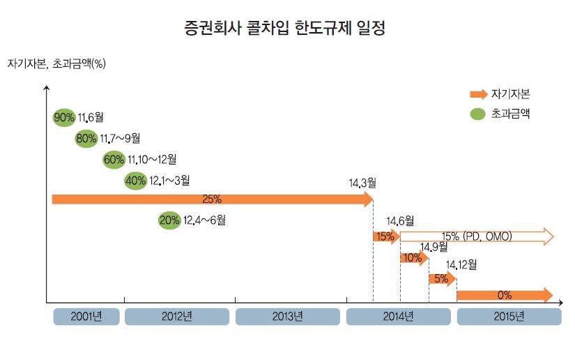 정부는 2011년6월 단기자금 시장 효율성과 안전성 제고를 위해 콜시장 개편안을 마련했고 단계적으로 콜시장 참여를 제한해왔다. 현재 증권사들은 자기자본의 5% 이내에서 콜차입이 허용되고 있다. 내년부터는 국고채 전문딜러(PD) 및 한국은행 공개시장조작대상(OMO) 증권사를 제외한 증권사의 콜시장 참여가 불가능해진다.