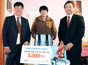 ▲한국예탁결제원= 13일 부산에서 한국장애인개발원과 함께 장애아동에게 휠체어를 전달했다(사진). 휠체어 지원 사업은 2012년부터 3년간 총 66명에게 1억3000만원을 후원했으며 올해에는 본사 이전지역인 부산을 직접 방문해 전달했다. 이번에 전달한 휠체어는 지체 및 뇌병변 장애 등으로 어려움을 겪고 있는 아동들을 위해, 맞춤형으로 제작된 유모차형 휠체어다.