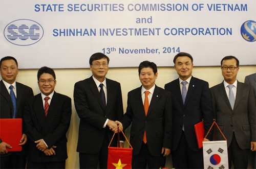 ▲신한금융투자= 국내 금융기관 최초로 베트남 국가증권위원회(SSC)와 협력협약을 맺었다. 신한금융투자는 2016년 오픈 예정인 베트남 선물옵션 시장에서 인프라 구축과 앞으로의 시장운영 등과 관련된 노하우를 제공하게 된다. 이날 협약식에는 SSC측에서 부치쭝 국제협력국장(아래 사진 왼쪽부터), 응웬탄롱 부위원장, 부방 위원장과 신한금융투자의 강대석 사장, 김태성 경영관리본부장 및 금융감독원 박석곤 하노이 사무소장이 참석했다.