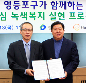 ▲한화투자증권= 13일 오전 영등포구청과 도심지에 녹지공간을 조성하기 위한 협약을 맺었다. 협약을 통해 구는 대상지를 제공, 한화투자증권은 녹지공간 조성 비용과 휴게시설 확충 등을 하게 된다. 주진형 한화투자증권 대표이사(사진 왼쪽부터)와 조길형 영등포구청장이 협약 체결뒤 기념촬영을 했다.