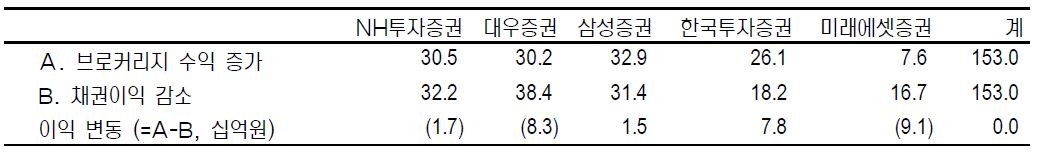 | ▲ 현대증권이 분석한 주요 증권사의 2분기 채권운용 감소와 브로커리지 수익 증가 추정. 금리 30bp 변동, 거래대금 10조원 가정.(단위, 십억원, 출처:현대증권) |