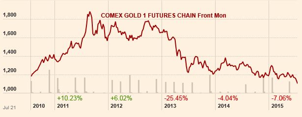 한때 온스당 2000달러를 넘봤던 금의 몰락은 이제 새삼스러운 일이 아니다. 금값은 오랫동안 1000달러대에서 꾸준히 등락했다. 지난해 중반부터 이미 하락 기조가 이어졌고 올해 들어서만 6%이상 빠졌다.
