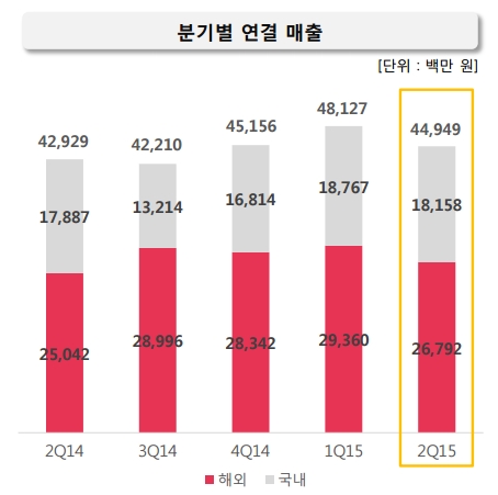 국내 매출 역시 전분기보다 3% 감소한 182억원에 그쳤다. 모바일 웹보드게임 매출이 늘었으나 기존 PC온라인이 힘을 보태지 못했다. 모바일 웹보드 ‘피망뉴맞고’는 올 3분기 중 네이버 자회사 캠프모바일의 밴드 게임을 통해 ‘피망뉴맞고 with Band‘로 출시될 예정이라 매출 확대가 예상된다.