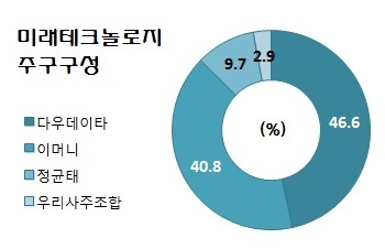 흥미로운 것은 다우그룹이 미래테크를 인수달 당시 관계사인 이머니도 참여했다는 점이다. 당시 이머니는 지분 32%를 39억원가량에 사들였다. 이듬해인 2013년에는 10%를 12억원에 추가로 인수하는 등 이머니는 현재 미래테크 지분 40.8%(163만주)를 소유한 2대주주로 있다.