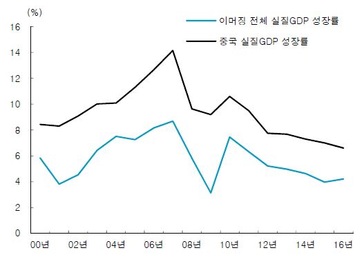 | ▲ 중국 및 신흥국 전체 GDP 성장률 추이(출처:한국투자증권) |