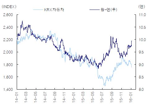 | ▲ 원-엔 환율과 자동차업종 지수 추이(출처:KTB증권) |