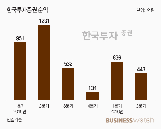 한국투자증권 관계자는 "브렉시트 및 하이일드 채권시장의 불안 등 글로벌 경기둔화 우려와 시중자금 부동화 현상 등으로 위탁매매 및 운용 부문에서 전년동기 대비 순이익이 감소했다"고 설명했다.