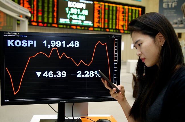코스피 지수가 40포인트이상 폭락하며 한 달 여만에 1990선으로 밀려났다. 미국의 금리인상 우려가 증폭된데다 북핵 리스크와 삼성전자 등 대내외 악재가 잇따라 터지며 블랙 먼데이를 연출했다. 대장주 삼성전자의 경우 7% 가까이 급락했다.