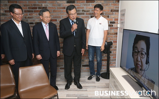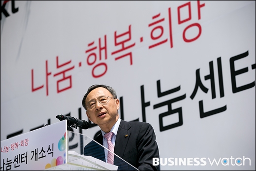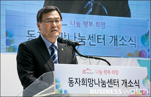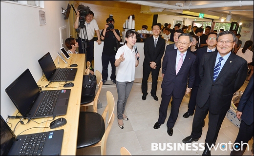 | ▲ 주민들이 문화예술을 향유할 수 있는 ICT복합문화공간인 ‘동자희망나눔센터’를 개관식이 24일 서울 용산구 동자동 1300여개의 쪽방촌이 밀집한 곳에서 열렸다. 최문기 미래창조과학부 장관, 황창규 KT회장 및 주요인사들이 개소를 알리는 퍼포먼스를 하고 있다. /이명근 기자 qwe123@ |