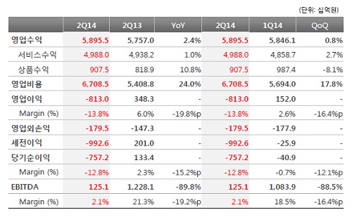 KT는 29일 '2014년 2분기 실적발표'를 통해 연결기준 매출은 유선을 제외한 모든 서비스매출 증가에 힘입어 전년동기 대비 2.4% 증가한 5조8955억원을 기록했다고 밝혔다. 다만 영업이익은 약 1조원 규모의 명예퇴직 비용이 일시 지급됨에 따라 8130억원의 손실을 기록, 전년동기대비 적자전환했다. 당기순손실 규모도 7572억원에 달했다.