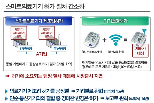 현행 법령에 따르면 스마트 헬스케어 기기 제조를 위해서는 동일기업 일지라도 제조 공장별로 제조업 허가를 따로 받아야 한다. 스마트 헬스케어 기기는 전자제품 형태로 출시되어 공장별 완제품의 성능차이가 없으나 동일 기업이라도 공장별로 제조업 허가를 받고 있어 평균 25일의 행정절차가 소요되고 있다. 또 허가 받은 기기에 통신 모듈을 단순 결합한 의료기기를 출시하기 위해선 의료기기 재허가를 받아야 하는데, 이는 평균 6.2일이 소요된다.