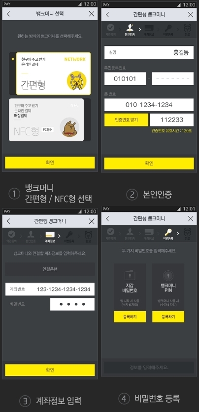 | ▲ 뱅크월렛카카오는 뱅크머니 간편형과 NFC형 두가지 가운데 하나를 등록한 이후 본인인증 및 은행 계좌정보 입력 등의 과정을 거쳐야 사용할 수 있다. |