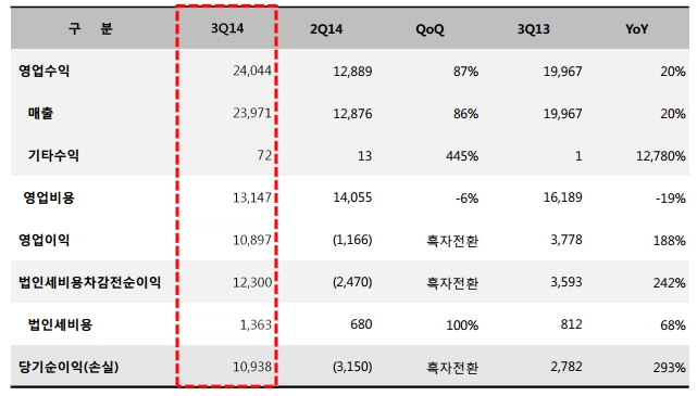 매출도 240억원으로 전년동기(200억원)보다 20% 증가했고, 전분기(129억원)에 비해서도 110억원 가량 늘었다. 순이익은 109억원으로 전년동기(28억원)보다 3배 이상 늘었고 전분기 31억원 순손실에서 흑자전환했다.