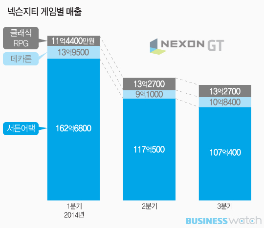 온라인 1인칭슈팅(FPS)게임 ‘서든어택(2013년 매출 비중 89.0%)’과 다중접속역할수행게임(MMORPG) ‘데카론(10.4%)’에서 거의 대부분의 매출을 올려왔던 넥슨지티에 올해부터 ‘테일즈위버’, ‘바람의 나라’ 등과 같은 ‘클래식 RPG’라는 새 수익원이 생겼지만 실제 매출 기여도는 낮다는 뜻이다.