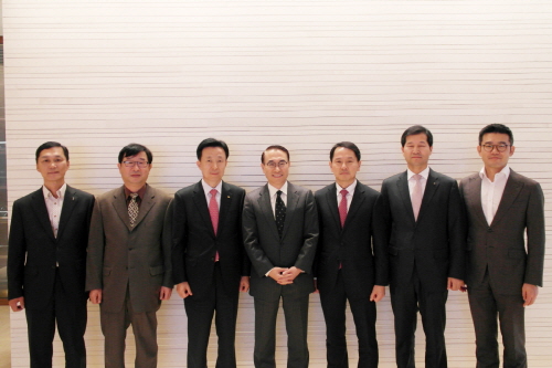 | ▲ 삼성전자는 24일 서초사옥에서 6개 신용카드 사장단과의 모임을 가졌다. 사진 왼쪽부터 롯데카드 고원석 본부장, NH농협카드 신응환 사장, KB국민카드 김덕수 사장,삼성전자 홍원표 사장, 삼성카드 원기찬 사장, 신한카드 이재정 부사장, 현대카드 원석준 본부장. |