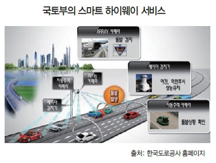 고속도로에서 돌발상황을 차량들에게 알려주는 '스마트 하이웨이(Smart Highway)' 서비스다. 국토교통부는 지난 9월부터 경부고속도로 서울요금소∼수원나들목 11km 구간에서 이 서비스를 시범 실시하고 있으며, 오는 2017년부터 단계적으로 상용화할 예정이다.