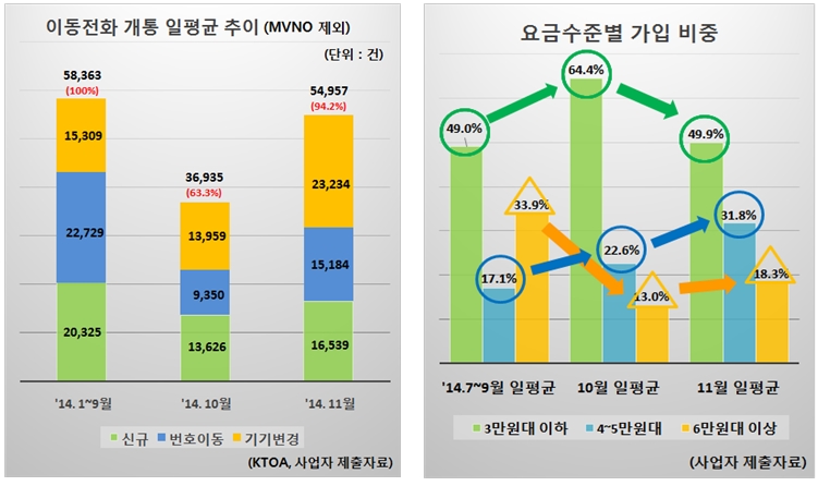 2일 미래창조과학부가 발표한 통계 자료에 따르면 지난 11월 한달간 일평균 가입자 규모는 5만4957건으로 단통법 시행 이전인 지난 1~9월 9개월 동안의 일평균(5만8363건) 수준을 회복한 것으로 집계됐다. 알뜰폰(MVNO) 사업자는 제외한 수치다. 이는 단통법 시행 직후인 지난 10월 한달간 일평균 규모(3만6935건)에 보다 1만8000건 가량 늘어난 수치다.