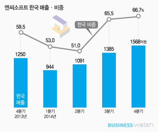 엔씨소프트는 이런 해외시장에서의 매출 둔화를 한국시장에서 메우고 있다. 실제 작년 1분기 944억원에 불과했던 한국 매출은 1090억원, 1390억원에 이어 4분기에는 1570억원으로 예외없이 매분기 불어났다.