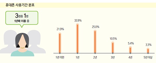 조사결과에 따르면 응답자 1만172명중 9413명이 휴대폰을 보유하고 있다고 답해, 휴대폰 보유율은 92.4%로 나타났다. 보유중인 휴대폰을 1년간 사용하고 있다는 응답자가 33.9%로 가장 많았고 2년 사용자는 25.0%, 1년 미만 사용자는 21.9%로 조사됐다. 3년간 사용하고 있다는 사용자는 10.5%, 5년 이상 사용하고 있다는 응답자도 3.3%나 됐다.