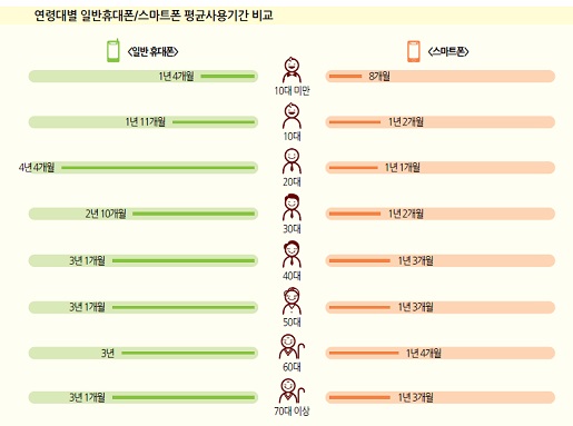스마트폰과 피처폰의 평균사용기간을 비교해 보면 스마트폰은 평균 1년2개월, 피처폰은 평균 3년 사용하는 것으로 나타났다. 휴대폰 유형별로는 2G 피처폰 평균사용기간이 3년8개월로 가장 길었고, PDA폰(3년), 3G 피처폰(2년9개월), 3G 스마트폰(1년11개월), LTE 스마트폰(1년1개월), LTE-A 스마트폰(3개월) 순으로 나타났다.