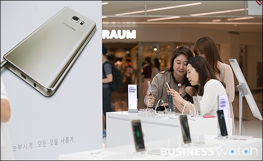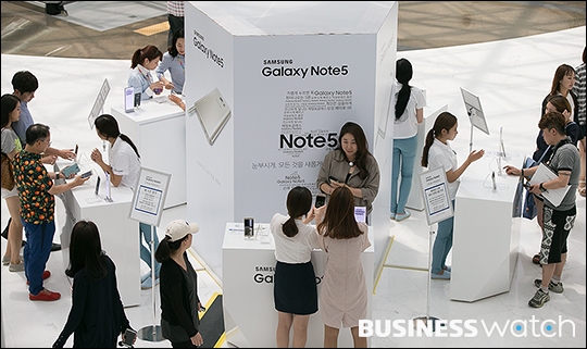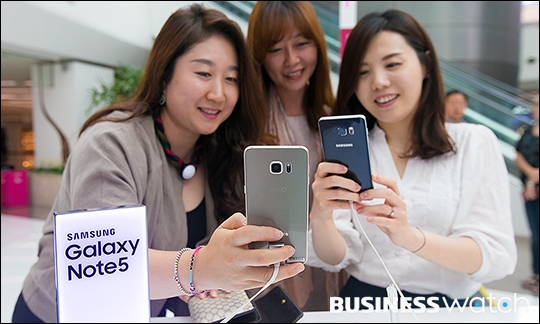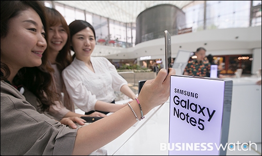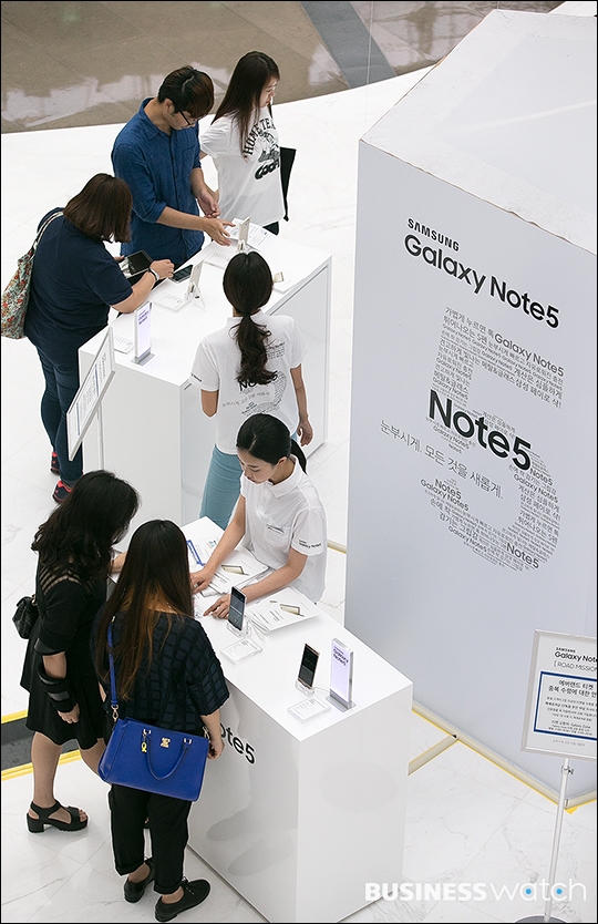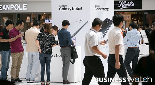 | ▲ 삼성전자 스마트폰 갤럭시노트5와 갤럭시S6엣지+의 국내판매량이 10만대를 돌파했다. 28일 서울 코엑스에 마련된 체험존 '노트5 로드'에서 점심시간을 맞은 직장인들이 스마트폰 체험을 하고 있다. /이명근 기자 qwe123@ |