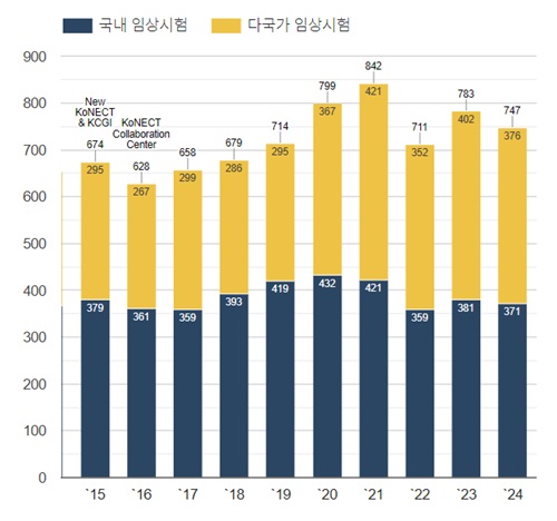 국가임상시험지원재단에 따르면 2024년 기준 전체 임상시험계획을 승인받은 건수 747건 중 50%에 달하는 376건이 다국가 임상시험인 것으로 나타났다. 다국가 임상시험은 한국을 포함해 2개국 이상에서 실시하는 것을 말한다.