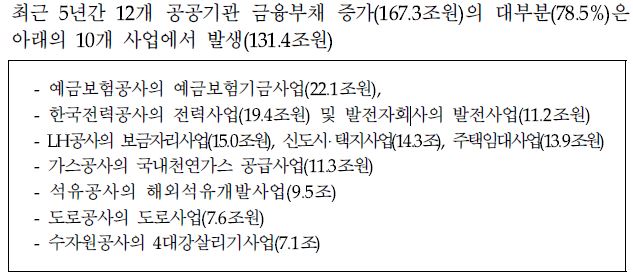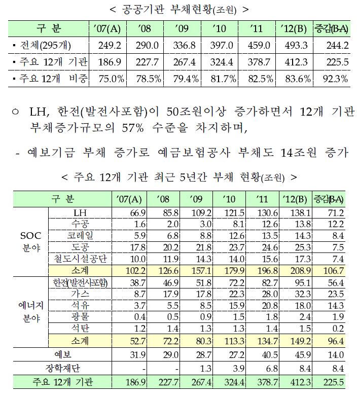 2012년 회계연도 국가결산에 따르면 공기업 부채는 지방 공기업까지 합하면 566조원으로 국가채무(중앙정부+지방정부) 443조원보다 훨씬 많다. 또 빚이 많은 12개 공공기관이 지난해 부담한 이자는 하루 평균 214억원에 달한다.