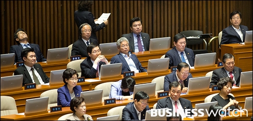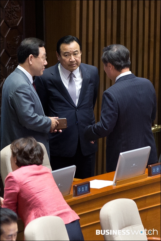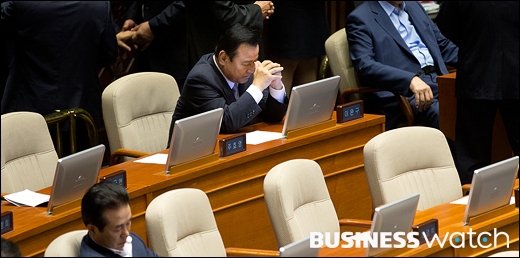 | ▲ 새누리당 이완구 원내대표는 26일 정의화 국회의장이 이날 열린 국회 본회의에서 안건 상정을 거부하고 30일 본회의를 재소집하기로 의사일정을 재조정한 것과 관련, 원내대표직 사퇴 의사를 전격 표명했다. 사진은 이날 본회의 파행 뒤 이완구 원내대표가 고민하는 모습. /이명근 기자 qwe123@ |
