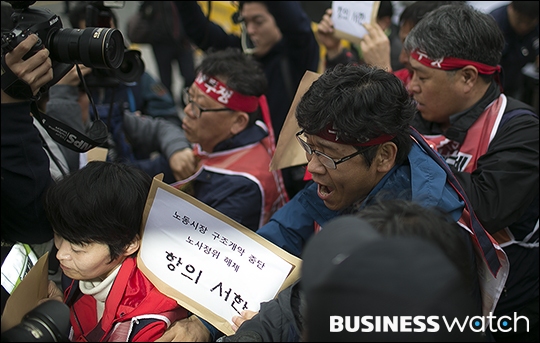 | ▲ 노동시장 구조개편을 위한 노사정 대타협 시한 마지막 날인 31일 오후 경제사회발전노사정위원회가 위치한 세종로 정부서울청사 앞에서 민주노총 노조원들과 경찰병력이 충돌하고 있다. /이명근 기자 qwe123@ |