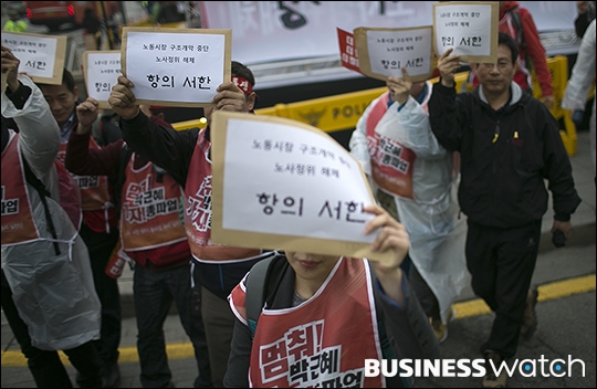한편에서 민주노총은 노사정위 해체를 요구하는 항의 서한을 전달하며 노사정위가 위치한 정부서울청사 앞에서 경찰과 충돌했다. 앞서 기자회견을 가진 양대노총 제조부문 공동투쟁본부는 "일방적인 합의를 강행하면 제조 부문 노동자들이 공동 총파업에 나설 것"이라고 목소리를 높였다.