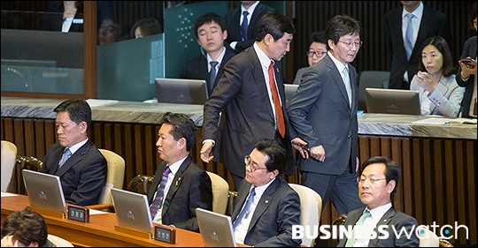 | ▲ 이종걸 새민련 원내대표 손잡고 나가는 유승민 새누리 원내대표 |