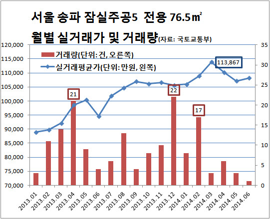 이 단지의 실거래가는 정책 호재가 있을 때마다 가파른 상승세를 보였다. 박근혜 정부가 주택경기 부양 의지를 강조하며 들어서던 작년 초, 국토교통부가 초과이익 환수제 폐지 등 재건축 규제완화 계획을 밝힌 올 초 등의 시기가 대표적이다.(첫 그래프 참조)