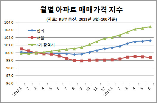 하지만 이런 움직임이 주택시장 전반의 움직임을 선도하고 있다고 보긴 무리가 있다. KB국민은행의 월별 통계 흐름을 보면 같은 기간 전국 아파트매매가격 지수는 1.5% 상승하는 데 그쳤고, 서울 아파트 매매값은 오히려 1.1% 하락했다.(두번째 그래프 참조) 과거처럼 재건축 시장의 동향을 주택시장 변동의 '바로미터'로 보기 어려운 이유다.