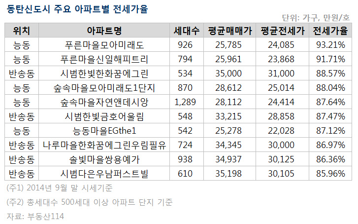 장용훈 부동산114 선임연구원은 "소득 수준이 뒷받침되는 삼성전자와 그 주변 협력업체 종사자들이 직장 근처에 집을 사려하기보다는 전세를 선호하고 있는 것이 동탄의 매매가 대비 전세가 비율이 높은 배경"이라고 설명했다.