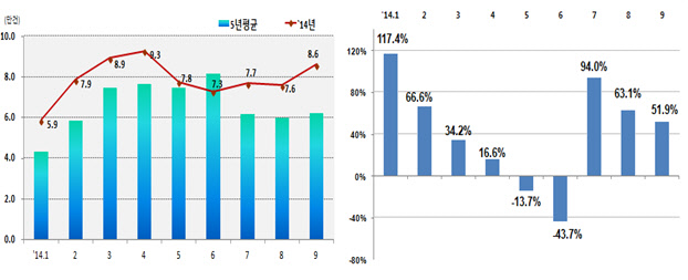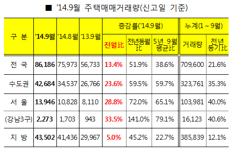 국토교통부는 지난 9월 전국 주택거래량이 8만6186건을 기록하며 전월 대비 13.4%, 1~9월 누계로는 70만9600건으로 작년보다 21.6% 늘어났다고 14일 밝혔다.