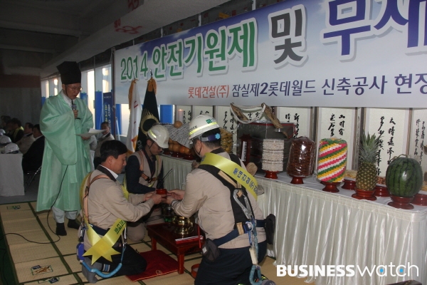 잠실 롯데월드타워 저층부 쇼핑몰 개장을 하루 앞둔 지난 13일, 롯데건설은 공사가 계속 진행되고 있는 롯데월드타워 51층에서 무사고 및 무재해 준공을 기원하는 안전기원제를 열었다. 통상 공사를 시작하면서 지내는 안전기원제가 한창 공사가 진행중인 건설현장에서 열린 것은 이례적인 일이다.