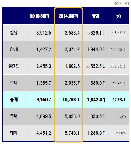 건설부문 내에서도 해외와 토목사업의 신장세가 두드러졌다. 올들어 3분기까지 해외 매출은 작년 같은 기간보다 29% 증가하며 국내(전년대비 증가율 7.5%)를 압도했다. 특히 토목사업(Civil사업부) 누적 매출은 3조3712억원으로 작년 같은 기간보다 136.2% 급증했다. 주택 매출도 2조357억원으로 작년에 비해 50.2% 늘었다.