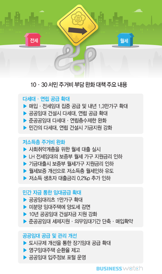 이번 대책에서 정부는 전세에서 월세로의 구조적 변화에 따른 주거비 경감에 무게를 뒀다. 전월세 전환과정에서 상대적으로 주거비 부담이 커지는 사회취약계층이나 보증부 월세 가구를 보호하는데 집중할 필요가 있다는 것이다.