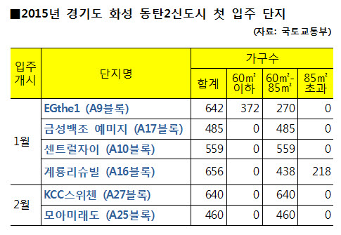 동탄2신도시는 내년 1월부터 첫 입주가 시작된다. 2012년 8월 가장 먼저 분양에 나섰던 시범단지 내 'EG the1' '금성백조 예미지' '센트럴자이' '계룡리슈빌' 등이 선두주자다. 이어 2월에는 'KCC스위첸' '모아미래도' 등의 단지에서 입주가 시작된다.