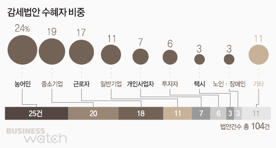 올해 연말 국회에서 논의할 감세 법안의 수혜자는 농어민이 가장 많은 비중을 차지했다. 전체 104건의 감세 법안 중에 25건(24%)이 농어민을 위한 세금 감면이었다. 주로 농어촌을 지역구로 둔 국회의원들이 유권자를 의식해 감세 법안을 쏟아낸 것이다.