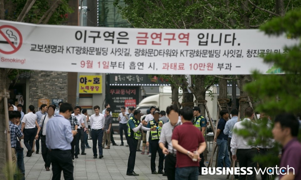 3일 오후 서울 도심의 한 금연구역에서 일반 시민들을 비롯해 경찰까지도 흡연을 하고 있는 모습이다.