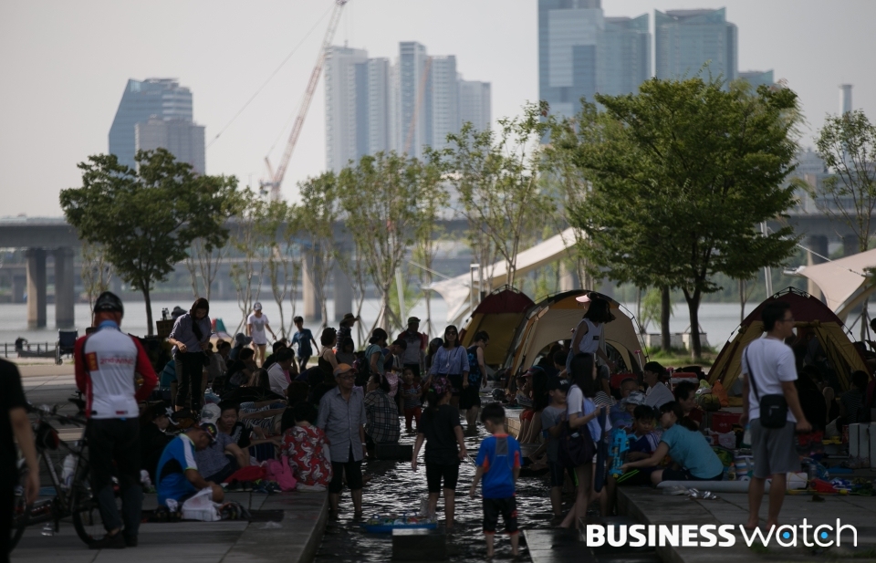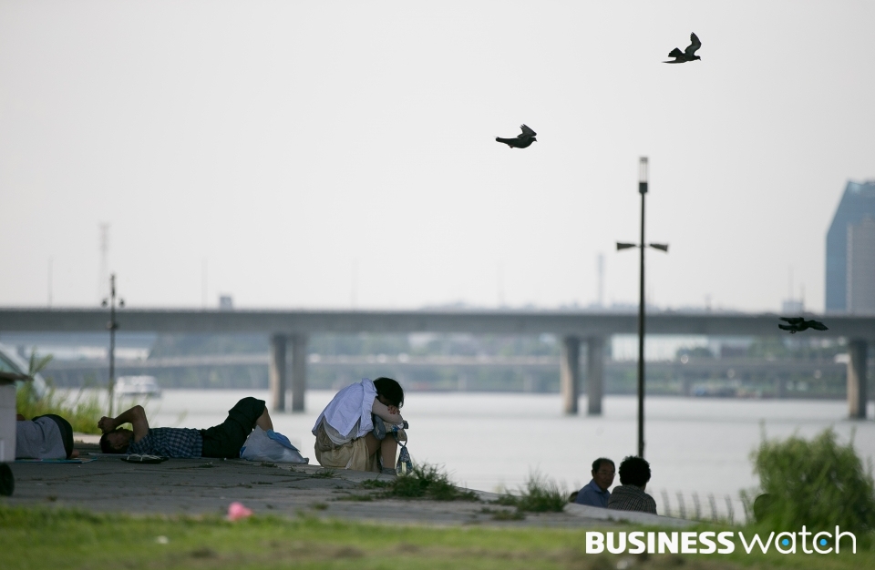| ▲ 햇볕이 내리쬐는 찜통더위를 피해 한강시민공원을 찾은 시민들이 다리그늘 아래에서 지친 모습을 보이고 있다. /이명근 기자 qwe123@ |